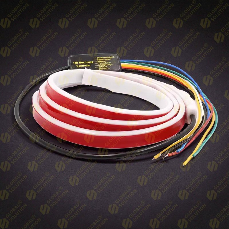 Просте Підключення 12V: Стрічка розроблена для прямого підключення до проводки задніх ліхтарів (Детальна схема підключення: Чорний - мінус, Червоний - плюс живлення, Білий - Стоп, Синій - Задній Хід, Жовті - Повороти).